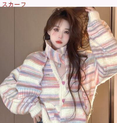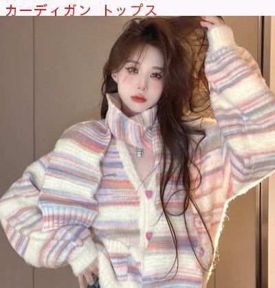 スウィート/優しい/レインボーストライプ/セーター/秋冬/長袖/ルース/韓国風/アンティーク調/カーディガン/アウターウェア/ニット/トップス/女