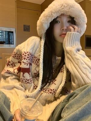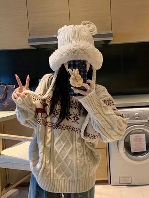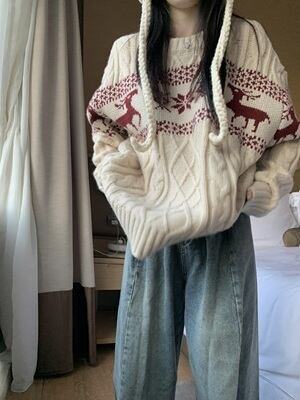 韓国シリーズ/クリスマス/雰囲気/重工/ジャカール/丸襟/アンティーク調/手厚い/ツイストセーター